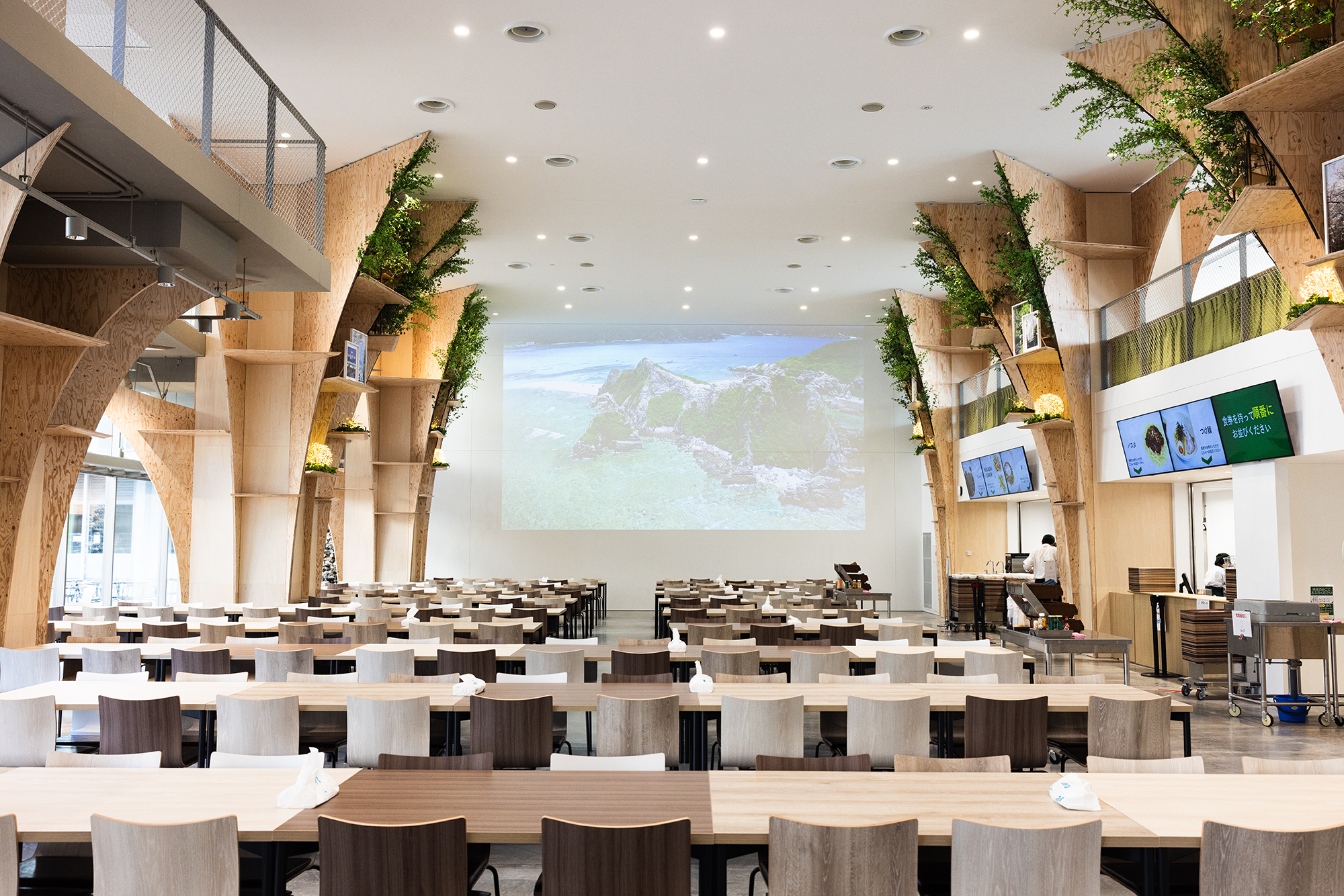 一番はコンテンツの多さです。当初、流したいと思っていた映像イメージは森の風景の映像だったんです。食堂の設計に木の素材をふんだんに取り入れているので、空間にマッチしそうだなと。だから自然の映像を流せる業者を探しました。いろいろと比較した結果、USEN MUSIC Entertainmentには世界各国の空撮映像が入っていることが話題に挙がり、世界の風景や建物の映像も学生さんに見せてあげたいね、という話になりました。森の風景だけでなく、いろいろと使えそうな映像があったので導入を決めましたね。
