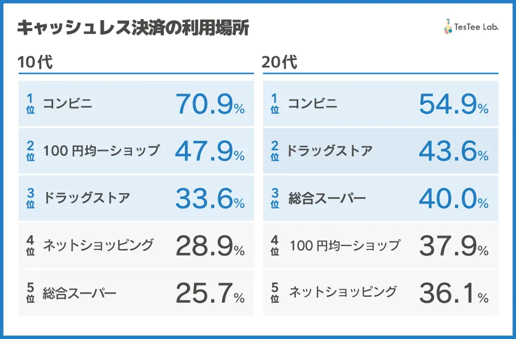 さらに、株式会社テスティーが行った「キャッシュレス決済に関する調査(2025年版)」では、年代別の利用場所において、10代では「コンビニ(70.9%)」「100円均一ショップ(47.9%)」、20代では「コンビニ(54.9%)」「ドラッグストア(43.6%)」が上位を占めており、若い世代でもキャッシュレス決済の利用が進んでいます。