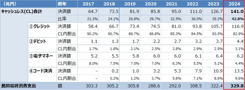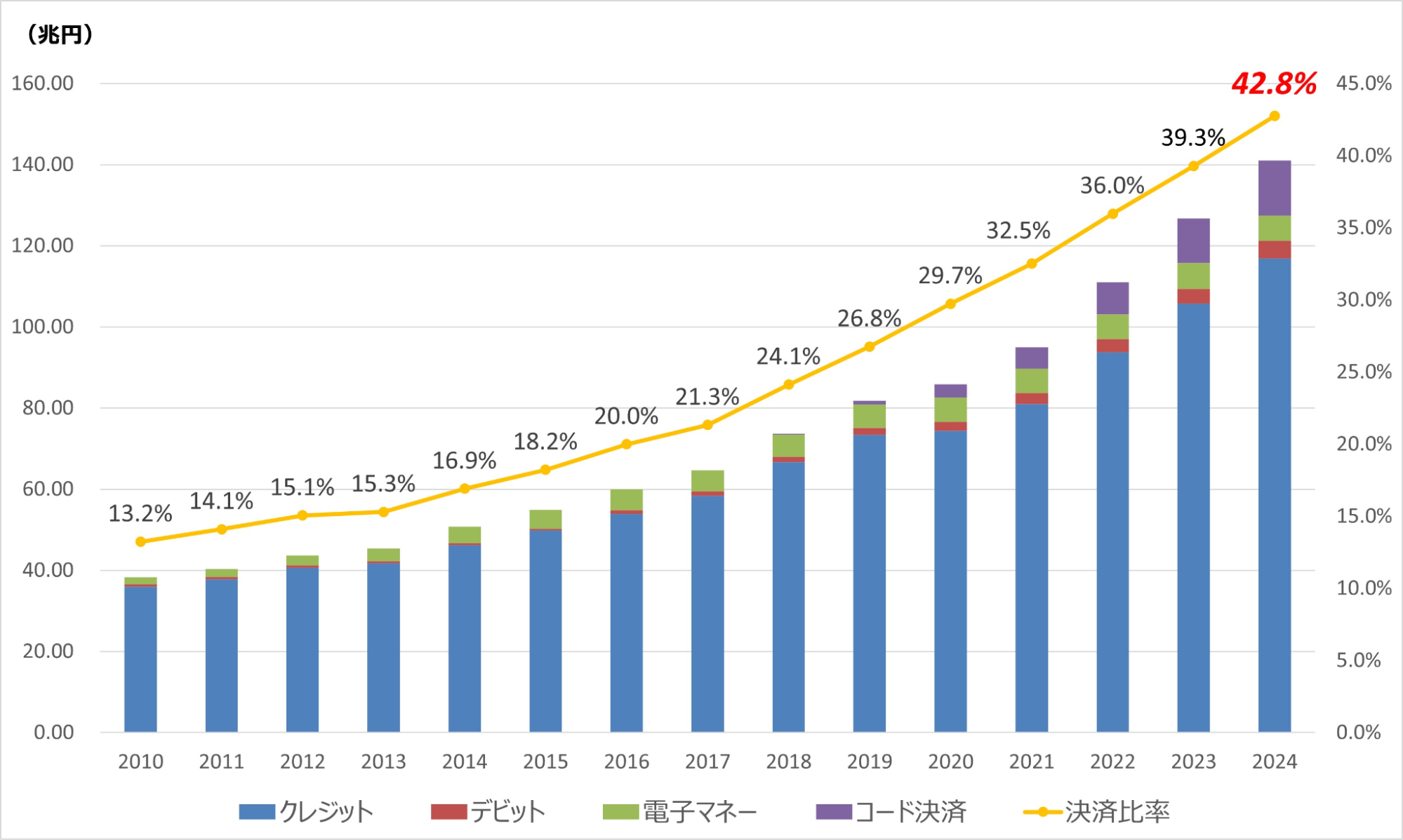 消費支出におけるキャッシュレス決済の比率は年々上昇を続け、2024年には42.8%(141.0兆円)に達し、政府が掲げていた2025年度までの40%という目標を前倒しで達成しました。