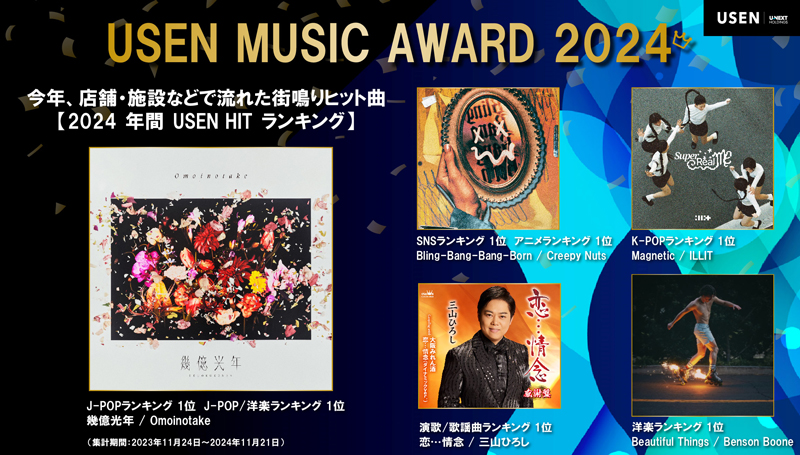 USEN&U-NEXT GROUPの株式会社USEN(本社:東京都品川区、代表取締役社長:貴舩 靖彦)は、『USEN MUSIC AWARD 2024』として、創業より60年以上運営する国内シェアNo.1(※)の業務用音楽配信サービスにおいて、オンエア実績やリスナーからのリクエストを基に独自集計した『2024 年間 USEN HIT ランキング』を本日2024年12月11日に発表したことをお知らせします。