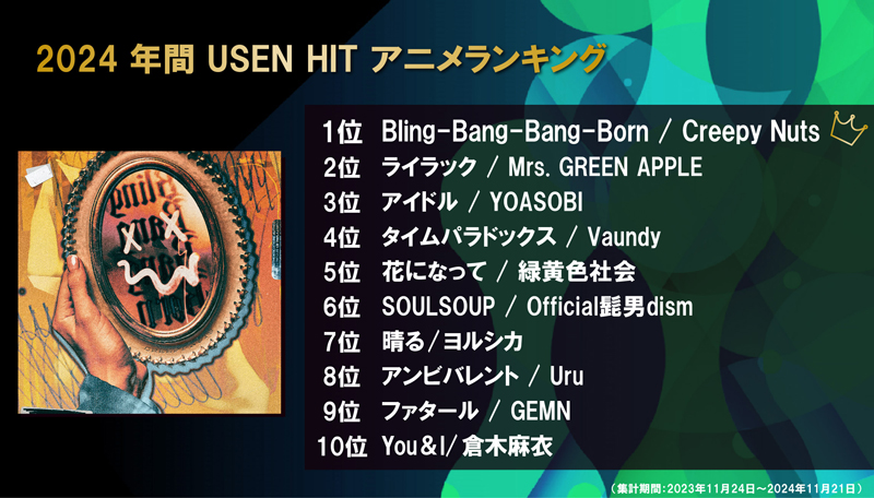 このたびUSENの2024年 年間ランキング SNS部門でCreepy Nutsの「Bling-Bang-Bang-Born」が1位をいただけたということで、ありがとうございます!多くの方にCreepy Nutsを聴いていただいて、とても刺激的な1年となりました!これからも応援していただけると嬉しいです!