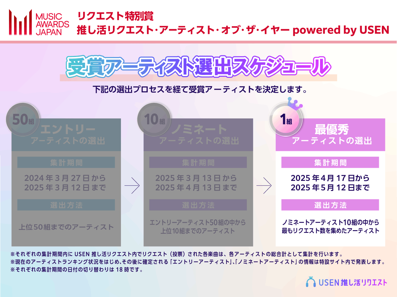 選出方法:「ノミネートアーティスト」の中から、下記集計期間のリクエスト数をもとに「最優秀アーティスト」を選出し、2025年5月21日(水)・22日(木)開催の「MUSIC AWARDS JAPAN 2025」にて表彰を実施します。