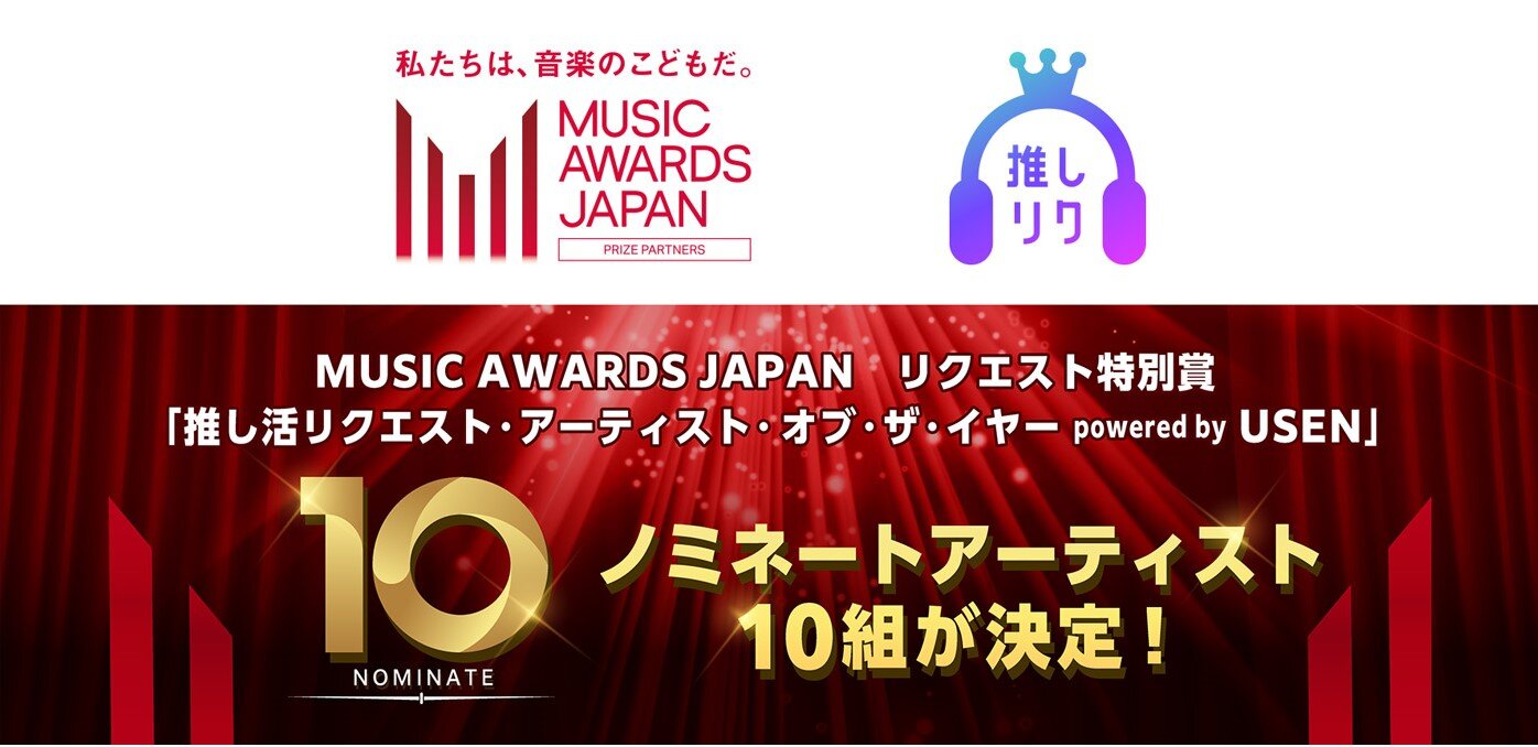 本アワードの「共創カテゴリー」内、リクエスト特別賞「推し活リクエスト・アーティスト・オブ・ザ・イヤー powered by USEN」の「最優秀アーティスト」の表彰に向け、「ノミネートアーティスト」10組(※1)が本日、4月17日(木)に決定したことをお知らせします。