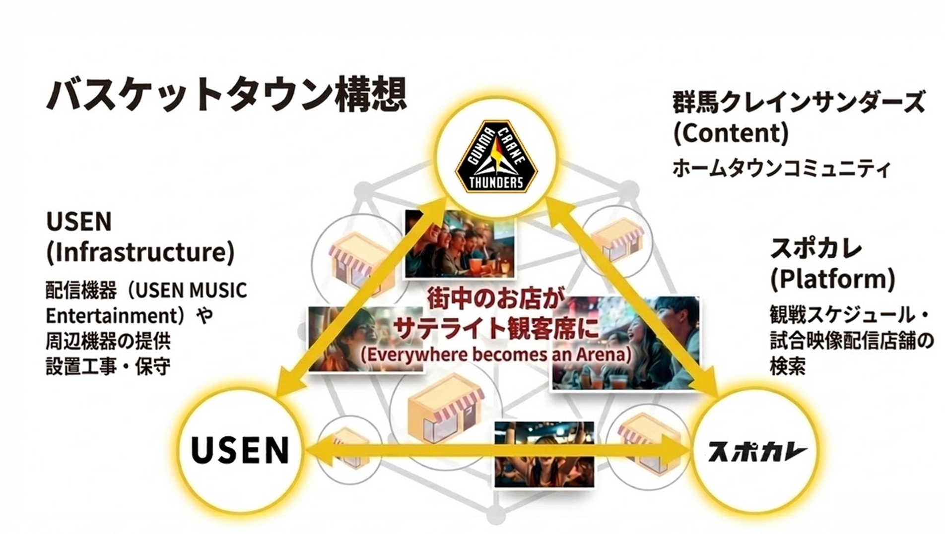 USEN、群馬クレインサンダーズ、スポカレの3社は、「バスケットタウン構想」を通じて、新たな観戦体験を創出し、地域の活性化とファンコミュニティの拡大に貢献してまいります。