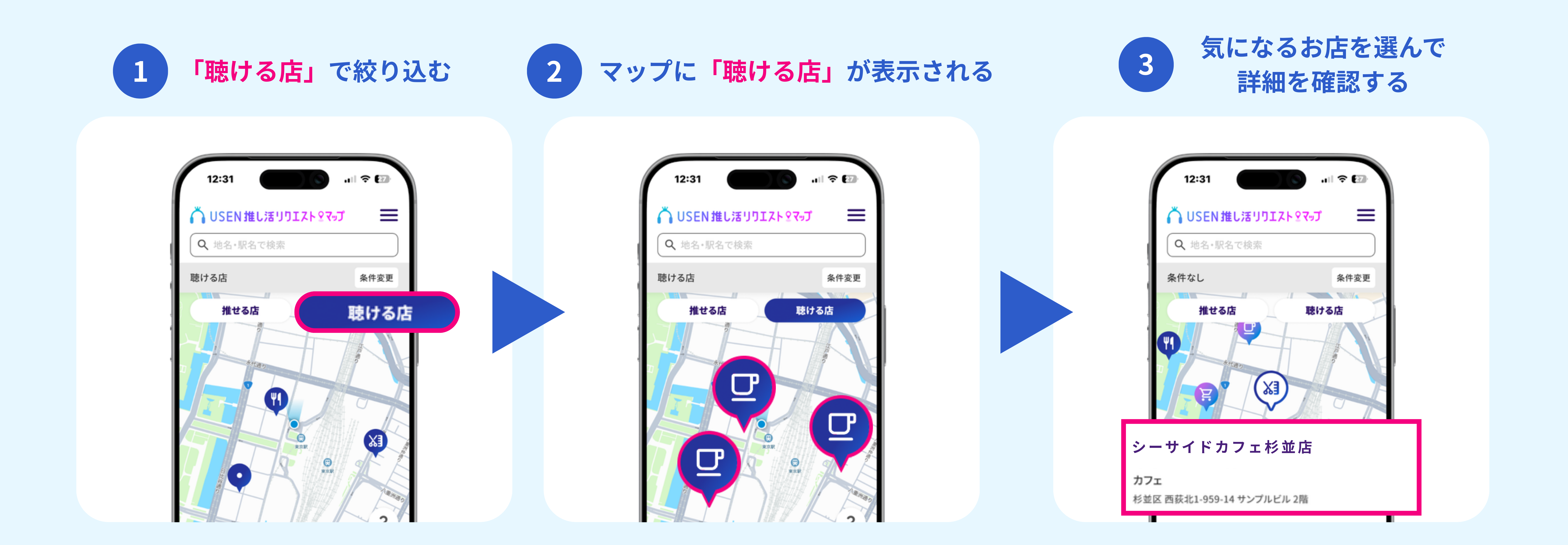 「聴ける店」ボタンを押すと、対象店舗(※2)のみマップに表示されます。