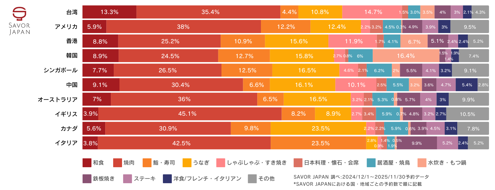 *SAVOR JAPANにおける国・地域ごとの予約数で順に記載