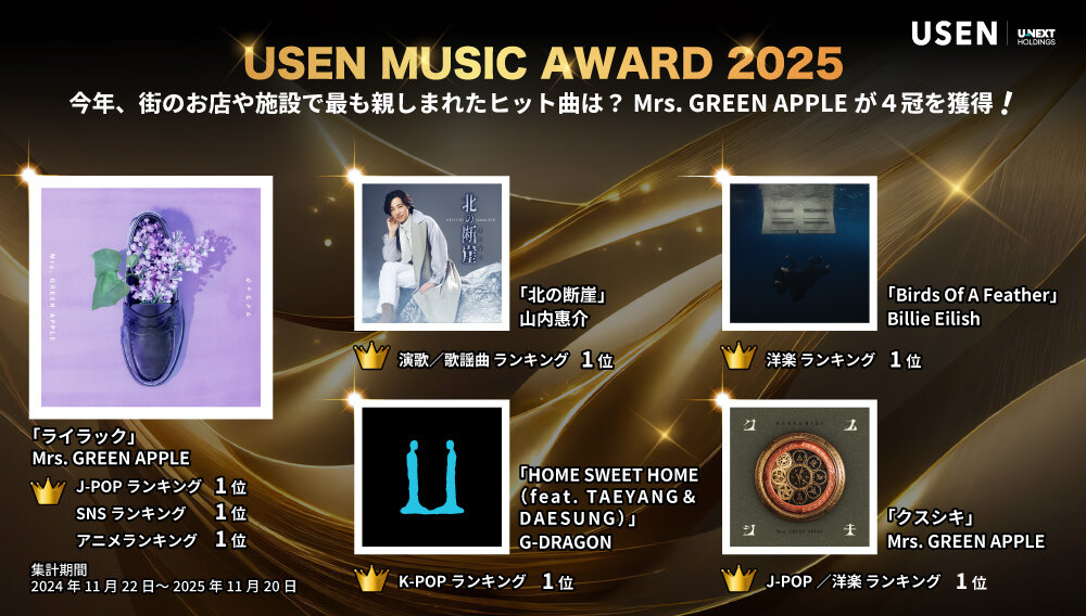 USEN&U-NEXT GROUPの株式会社USEN(本社:東京都品川区、代表取締役社長:貴舩 靖彦、以下、当社)は、本日12月11日(木)に『USEN MUSIC AWARD 2025』と題し、創業より60年以上運営する国内シェアNo.1(※1)の店舗BGMにおいて、オンエア実績やリスナーからのリクエストを基に独自集計した『2025 年間 USEN HIT ランキング』(※2)を発表しました。