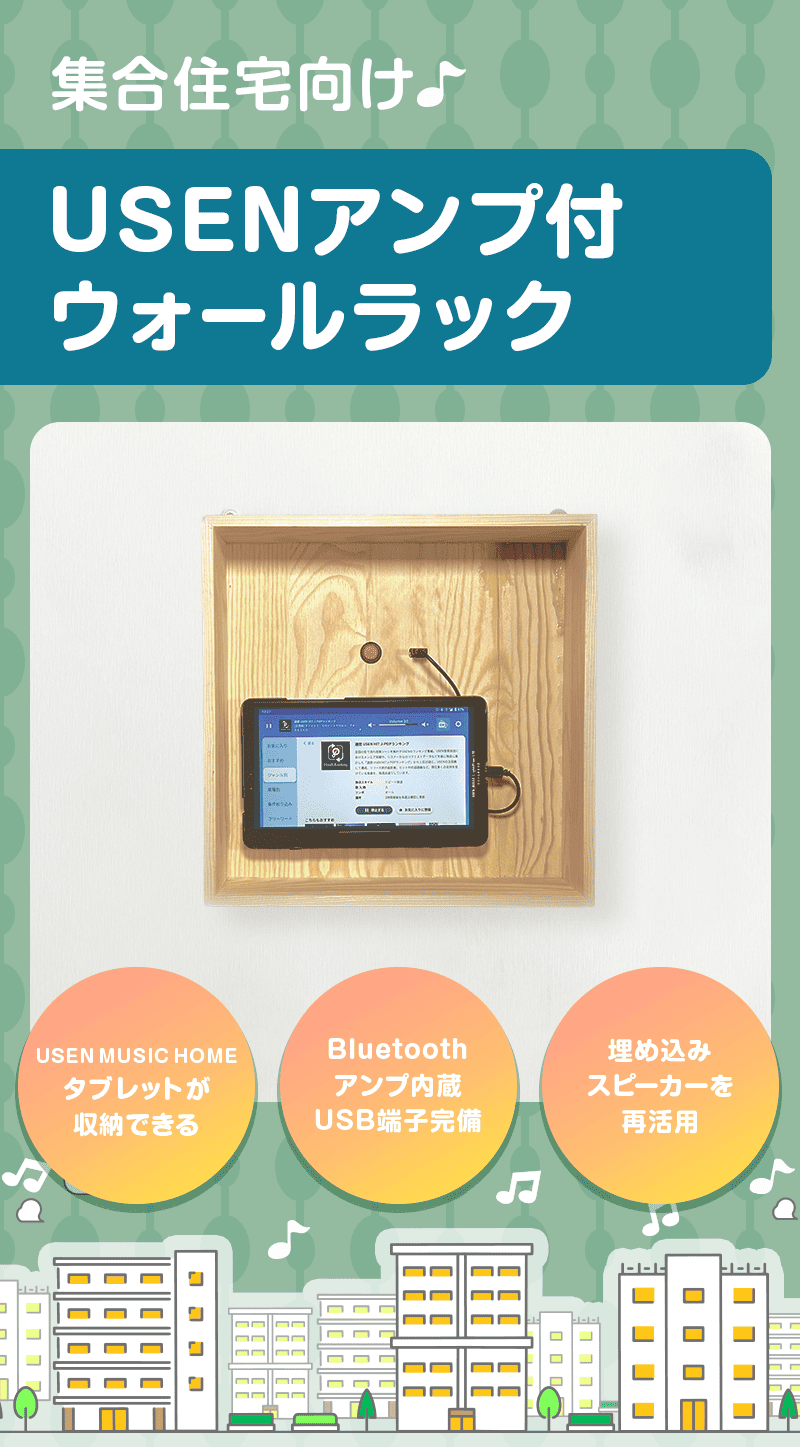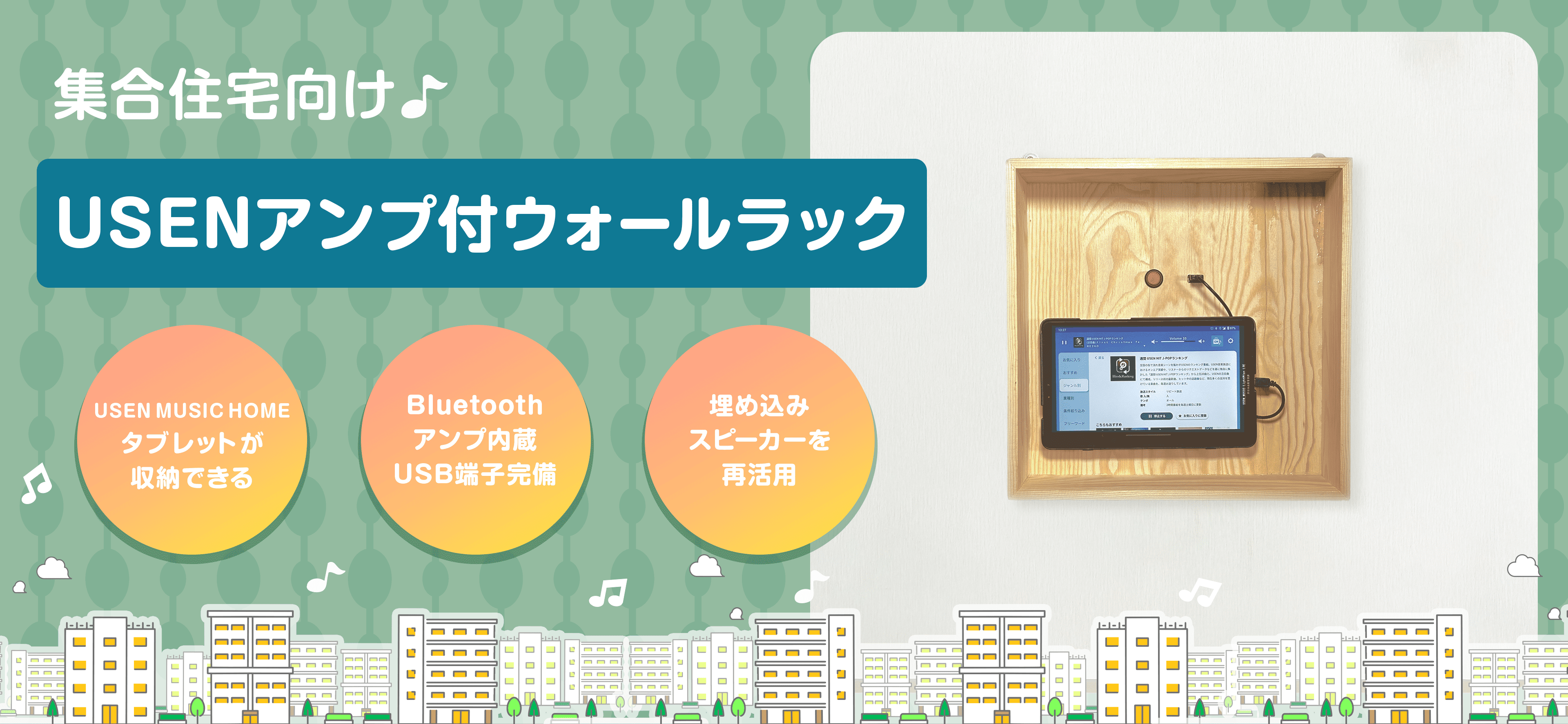 備え付けのUSEN設備を取り外し、新しいウォールラック型のUSEN設備に変更することができます。USEN MUSIC HOMEの専用タブレットを収納はもちろん、インテリアとして小物を飾ったりすることもできます。