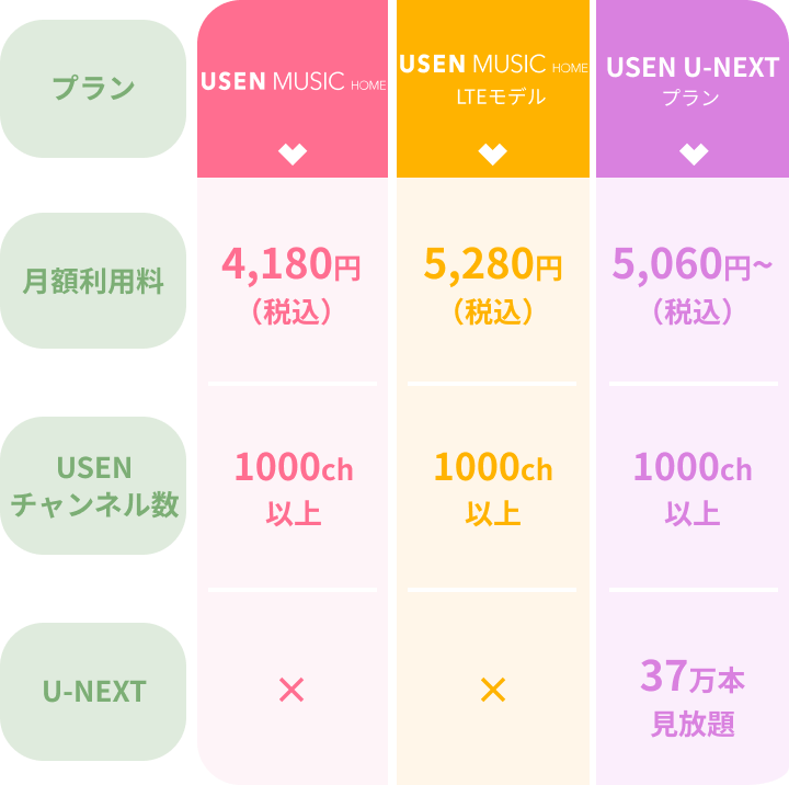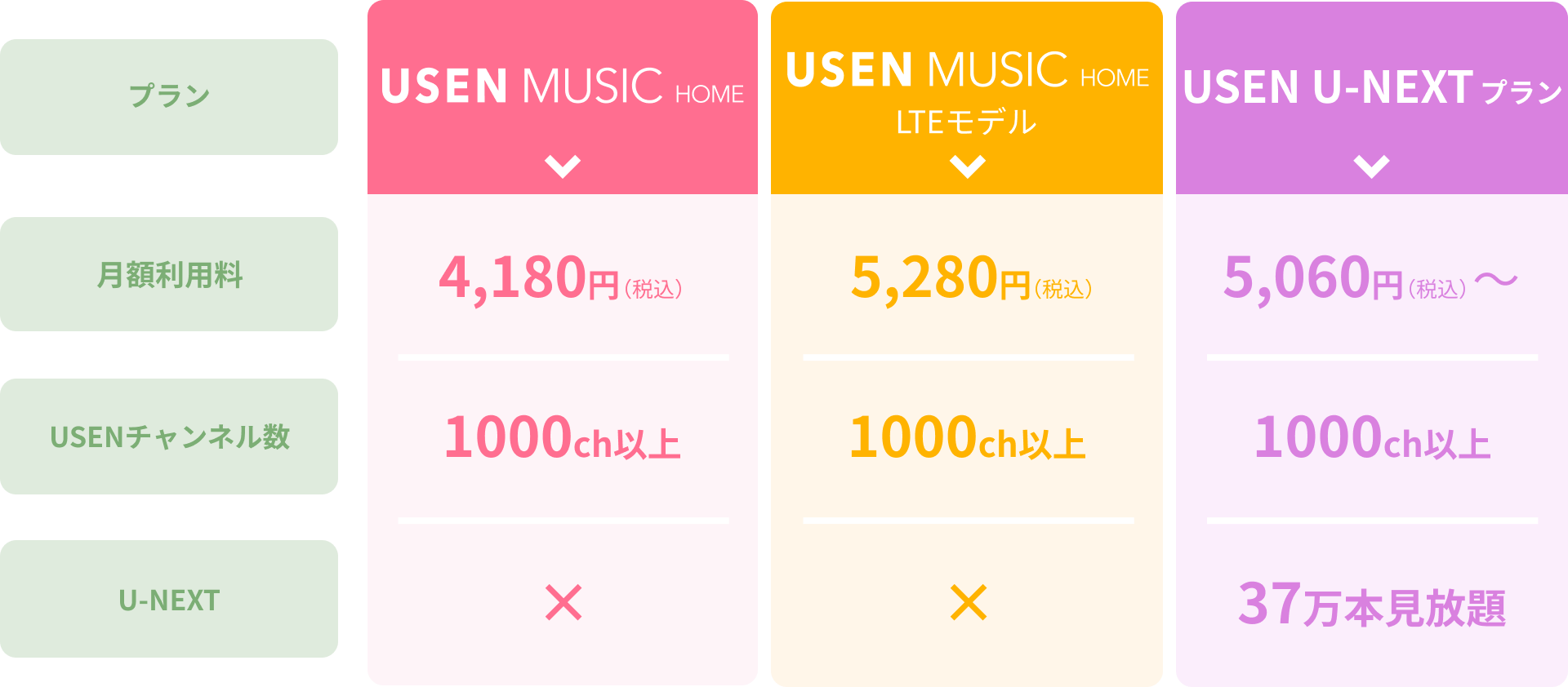 - USEN MUSIC HOMEは13,200円、USEN MUSIC HOME LTEは22,000円の初期費用が別途かかります。