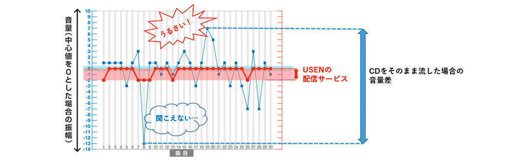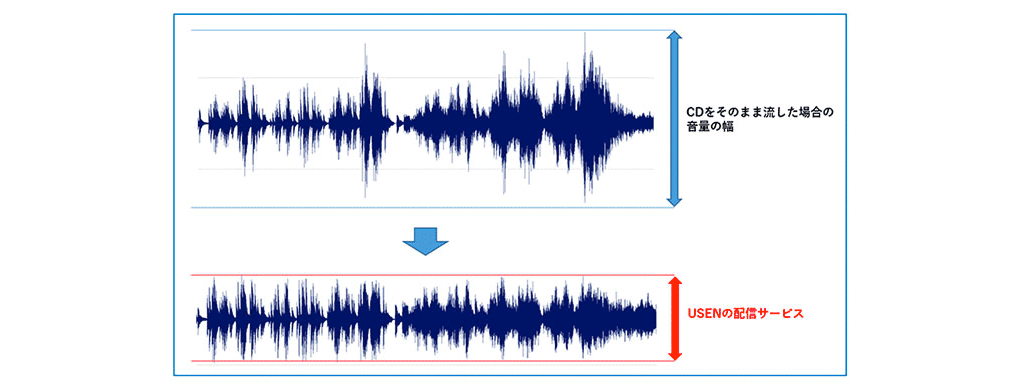 また、以下の図のように、一曲の中でもダイナミックレンジ(音の大小の幅)が大きな楽曲は、USEN独自の技術により、楽曲のイメージを損なうことなくその幅を狭め、BGM として聴きやすいように調整しています。