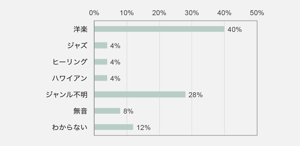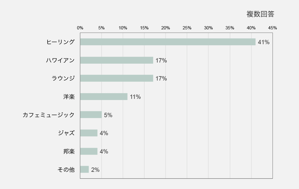 前問とは打って変わって、最も多かった回答は「ヒーリング」でした。ヘアサロンには、リフレッシュが目的で来ている方も多く、落ち着いてゆっくりとした時間を過ごしたい、ということでしょう。ついで「ハワイアン」も挙げられていますが、ハワイアン系の音楽も南国のリゾート感があり、リラックスできそうですね。前問の普段よく聴く音楽ジャンルとして挙げられたジャンルとはかなり異なっていることがわかります。もちろん自分の好きな音楽を聴くことでリラックス、リフレッシュできるということもあると思いますが、ヘアサロンで求められるのは、このグラフのような音楽ジャンルということですね。