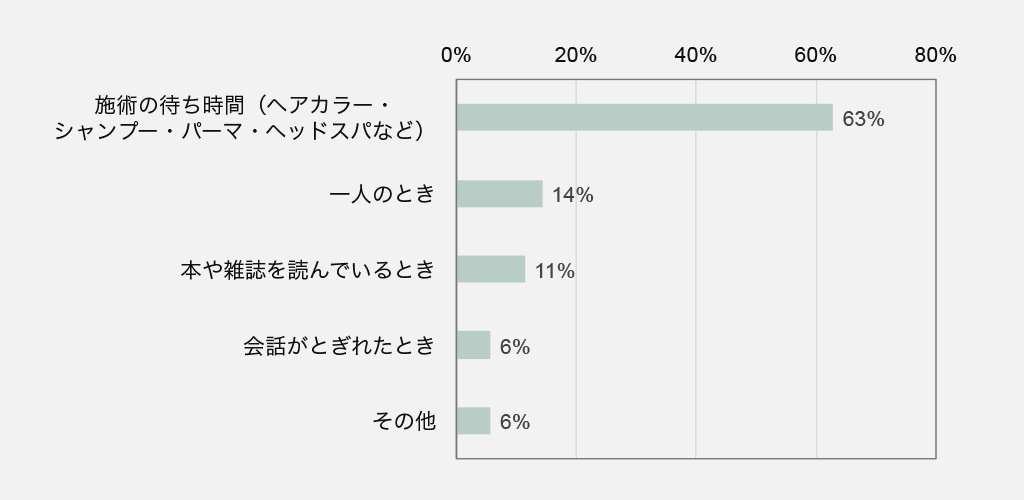 ヘアサロンではドライヤーの音など、大きい音も多く聴こえてくるため、常にBGMが聴こえているわけではないでしょう。最も回答の多かった施術の待ち時間は、美容師さんが常にそばにいるわけではありませんし、何もすることがない状況になることもあるため、自然と耳がBGMを捉えるのではないでしょうか。