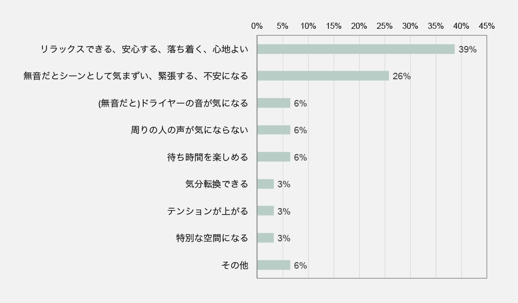 「リラックスできる」という回答が最も多く、ついで「無音だと気まずい」、「ドライヤーの音が気になる」、「(BGMがあると)周りの声が気にならない」、などの回答がありました。前問のどのような時にBGMが聴こえるか、という設問の回答の中に、「会話がとぎれたとき」というものがありました。会話がとぎれたときにBGMがないとシーンとしてしまいますよね。その気まずさを和らげるためにもBGMが必要だと考える人が多くいるのでしょう。