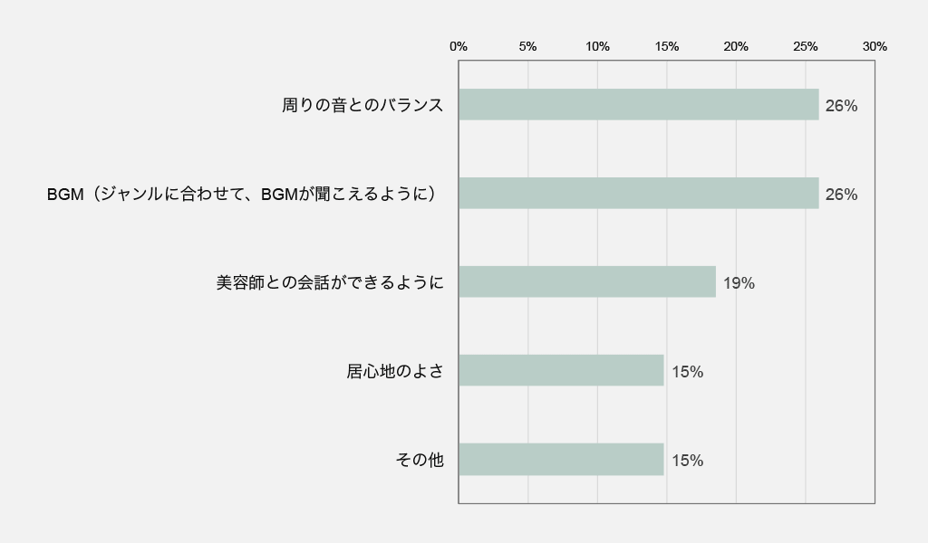 最も多かった回答は、周りの音とのバランスです。ヘアサロンでドライヤーの音や、シャンプー台の水音など、様々な音で溢れている上、ドライヤーなどは結構大きな音がするものですよね。そんな環境の中で、BGMの音量は小さいと全く聴こえないし、ドライヤー中でも聴こえるほど大きくすると他のお客様にとってはうるさく感じるでしょう。そのバランスがうまく取れると、必要なときに良い働きをしてくれるのではないでしょうか。