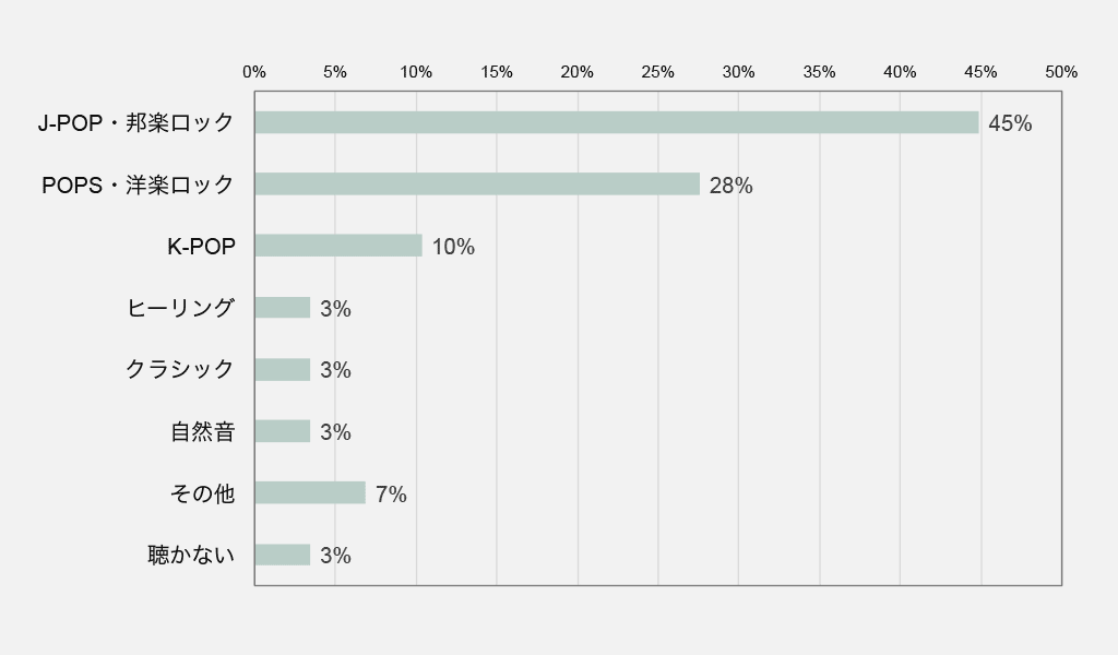 普段聴くジャンルは「J-POP・邦楽ロック」が多く、ついで「POPS・洋楽ロック」、「K-POP」と続きました。やはり、いわゆる流行の音楽が人気ですね。では、ヘアサロンでも流行の音楽を流すのがふさわしいのでしょうか。