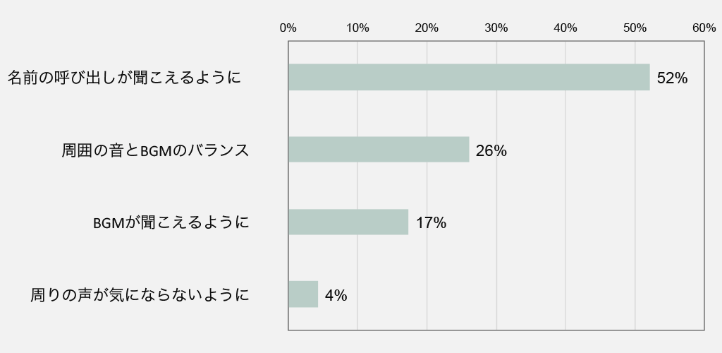半数以上の人が、「名前の呼び出しが聞こえるように」と答えました。たしかに病院では診察の待ち時間、会計の待ち時間と、名前の呼び出しを待つ時間が長いですよね。そのような時に、BGMの音量が大きすぎて名前を聞き逃すようなことになると困ります。2番目に回答が多かった、「周囲の音とBGMのバランス」というのも、名前の呼び出しの声は妨げないことが前提にあるようです。