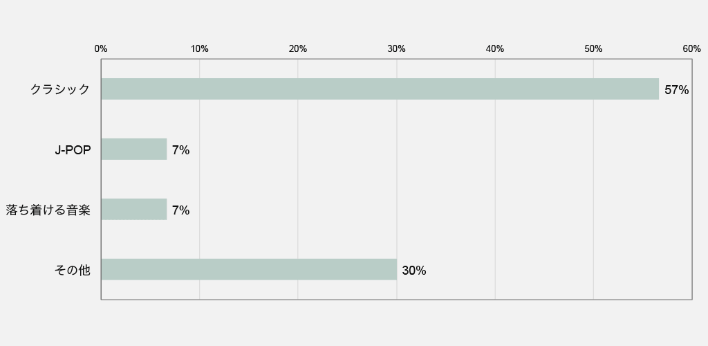 「クラシック」は半数以上の方から支持され、その他には「イージーリスニング」や「ヒーリング」など、癒しの音楽といわれるジャンルが多く挙がりました。やはり、体調が良くない時に、激しい曲調などは求められませんね。クラシックと一口で言っても様々な音楽がありますが、医療施設は比較的スローテンポで穏やかな楽曲をイメージされているのではないでしょうか。「落ち着ける音楽」「スローな音楽」という意見も見られるように、医療施設では穏やかで落ち着いた曲調が望まれるようです。