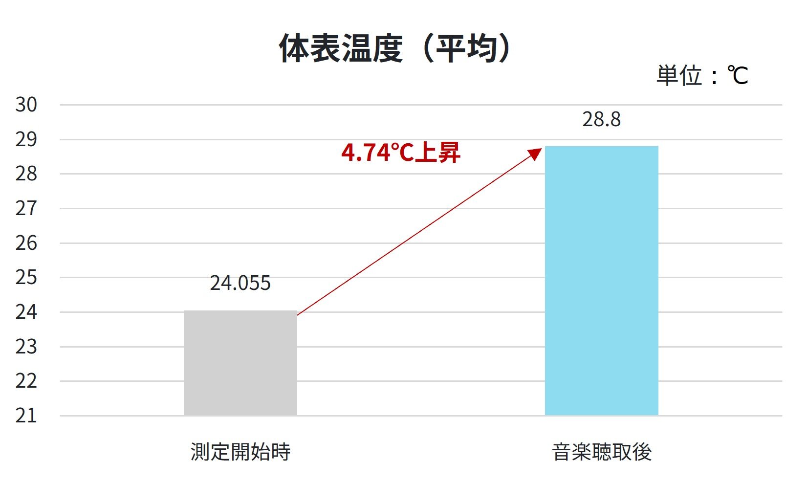 参加者全員の音楽聴取後の体表温度の平均値が、測定開始時と比較して上昇しました。