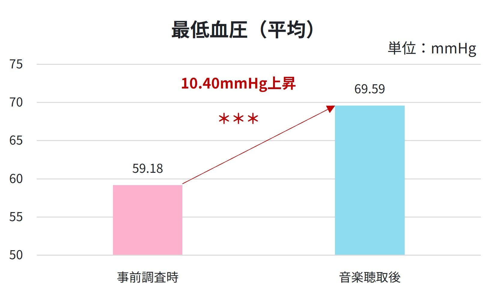 音楽聴取後、最高血圧が事前調査時と比較して上昇した15名中11名において、事前調査時と音楽聴取後の最低血圧の平均値を比較すると有意に上昇しました。(***p<0.001)