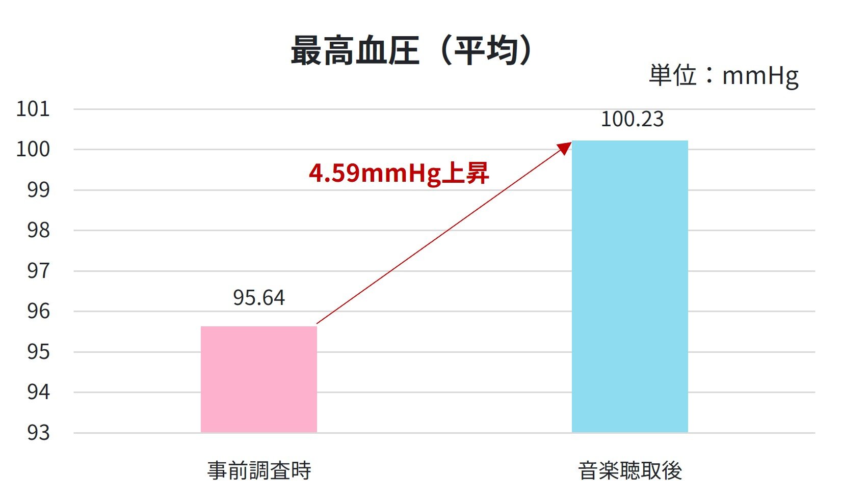 血圧、心拍数、体表温度が上昇したという結果は、交感神経の働きが強くなったと判断できるものです。つまり、音楽を聴くことで交感神経を刺激したといえる結果となりました。低血圧の方は、血圧や心拍数が上昇することで、全身の血流が良くなって体調がよくなった可能性があります。また、音楽聴取後は体調や気分の項目が全体的に改善される回答が得られました。交感神経が優位になって、気分が上向きになった可能性があります。音楽に対する好ましさも高かったですが、気持ちよいアップテンポな楽曲が多かったことも、気分の項目の改善につながった可能性があります。気分的なものにはどの曲がどのように効果があったのかがわかると、さらなる研究につながるのではないでしょうか。