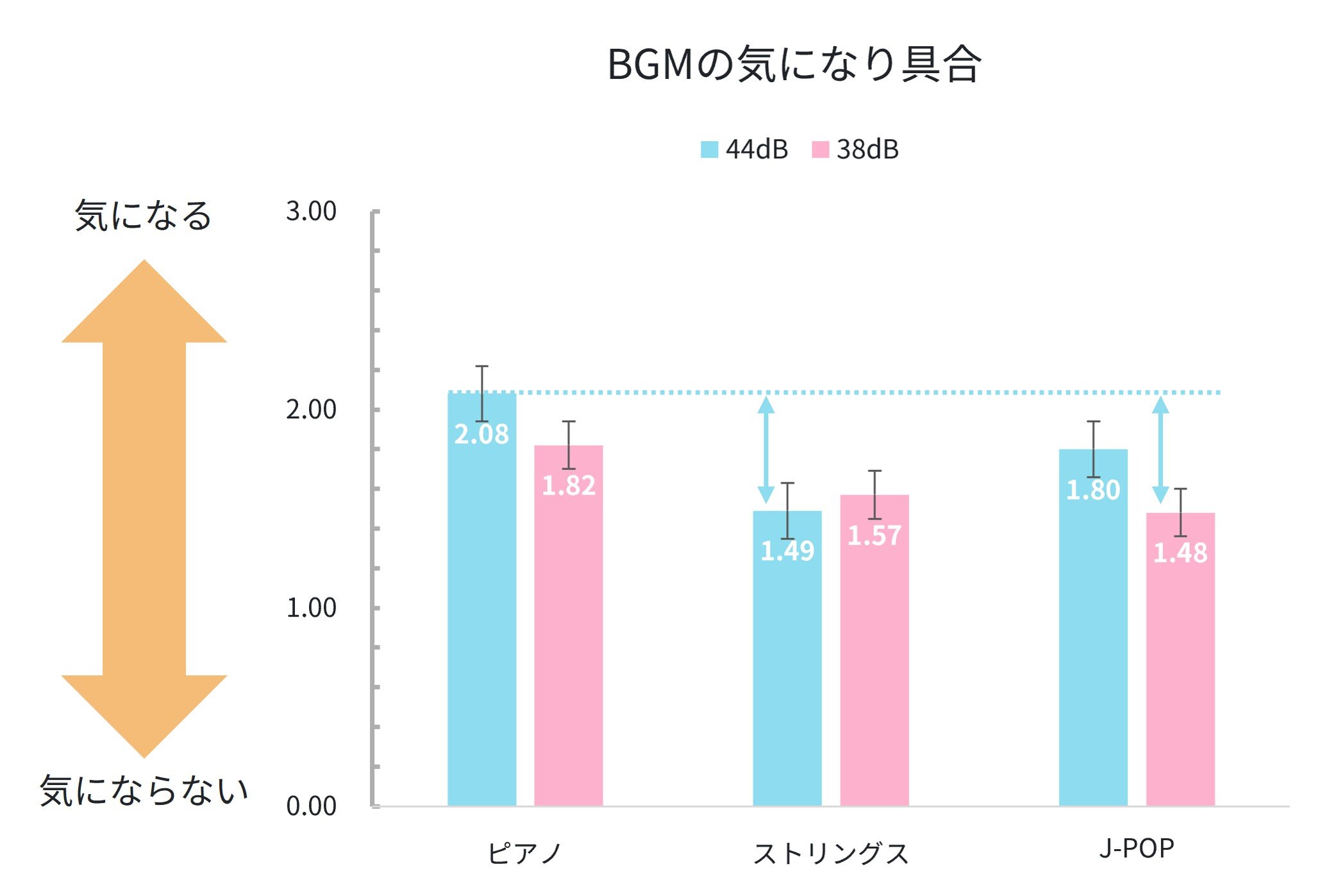 ピアノ中心のBGM(44dB)とそれ以外の条件に差異が見られました。ボーカル入りであるJ-POPであっても、他のインストゥルメンタルのBGMと比べて取り立てて気を取られるわけではないという結果が見られました。