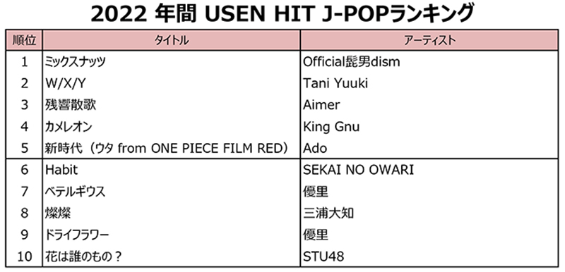 2022 年間 USEN HIT J-POPランキング