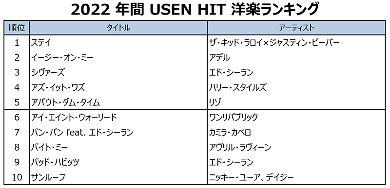 2022 年間 USEN HIT洋楽ランキング